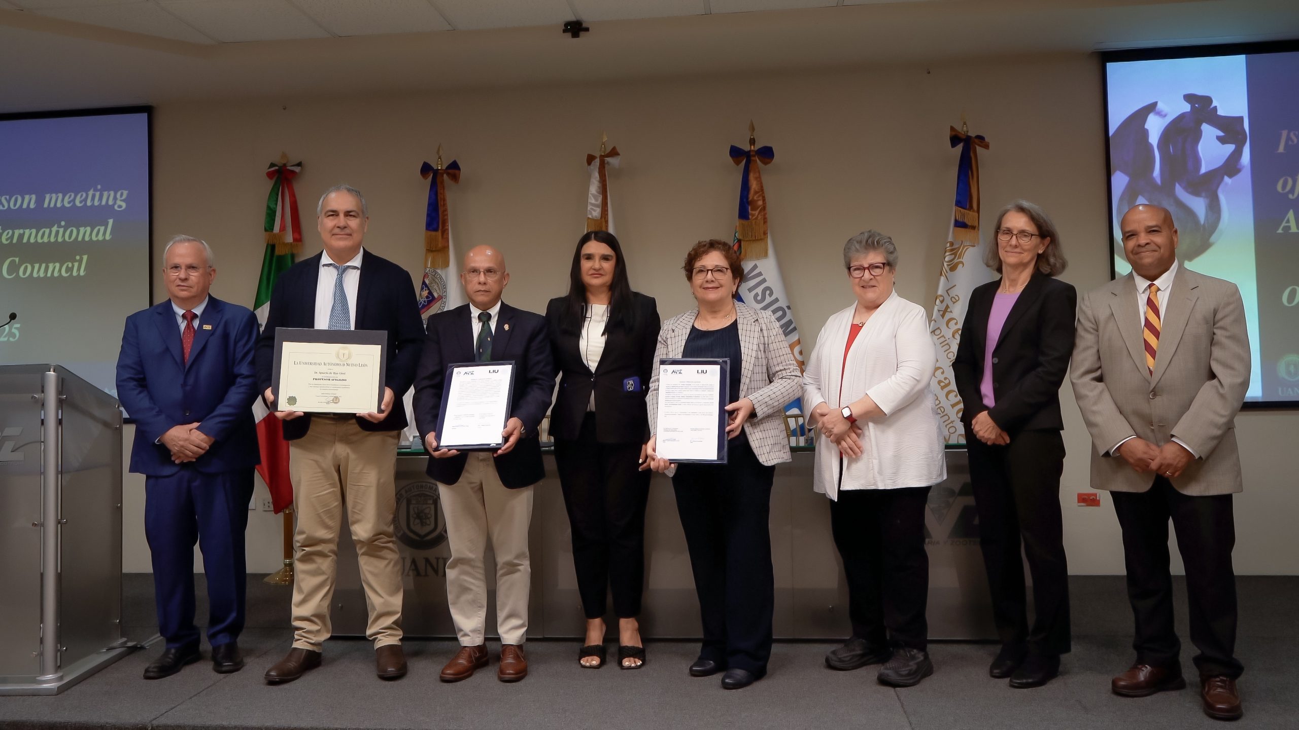 Desde el 8 y hasta el 10 de octubre del presente año se llevó a cabo la primera reunión presencial con los miembros del Consejo Asesor Internacional de nuestra facultad, en donde se entregó el nombramiento a cada uno de los miembros, así como la distinción al primer profesor afiliado de la facultad, el doctor Ignacio de Blas, catedrático de la Universidad de Zaragoza España, en el marco de esta reunión, se llevó a cabo la firma del convenio con el Colegio de Medicina Veterinaria de la Universidad de Long Island, fortaleciendo así la proyección internacional de nuestra facultad.